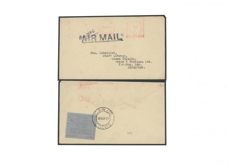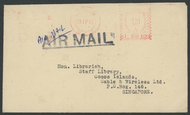 1951 (April 25) airmail envelope from Great Britain with London 1/- meter in red, to "The Librarian, Staff Library, Cocos Islands,