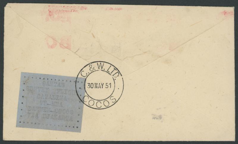 Cable & Wireless Ltd, PO Box 146, Singapore", makeshift typed 'QANTAS/SURVEY FLIGHT/CATALINA/VH-EBA/DARWIN-COCOS/VIA DJAKARTA' label tied to the reverse by a superb complete strike of 'C&W LTD/30MAY1951/COCOS' arrival backstamp, small closed tear