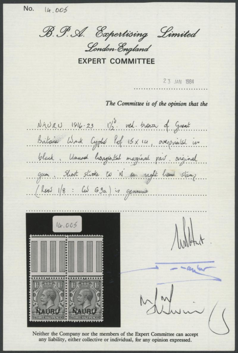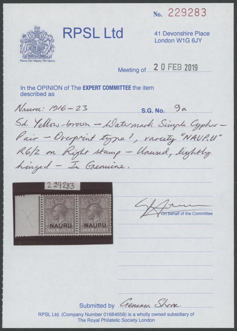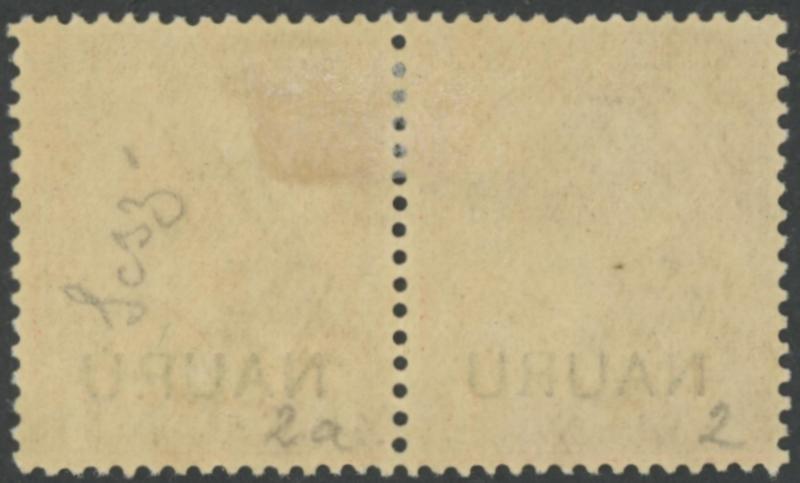 Broken 'R' in Overprint ('NAUPU') SG 9a, well-centred, small hinge remainder across both units, Cat £1800+ for singles. RPSL Certificate (2019).