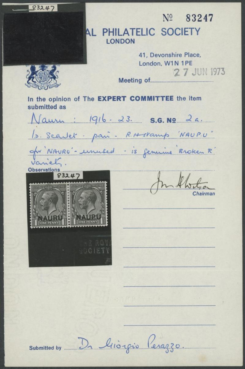 Overprint ('NAUPU') SG 2a, well-centred, small hinge remainder across both units, Cat £700+ for singles. RPSL Certificate (1973).