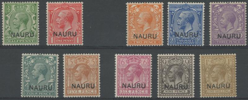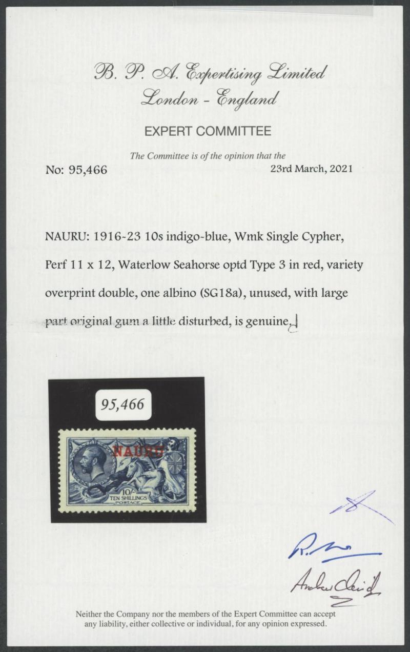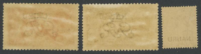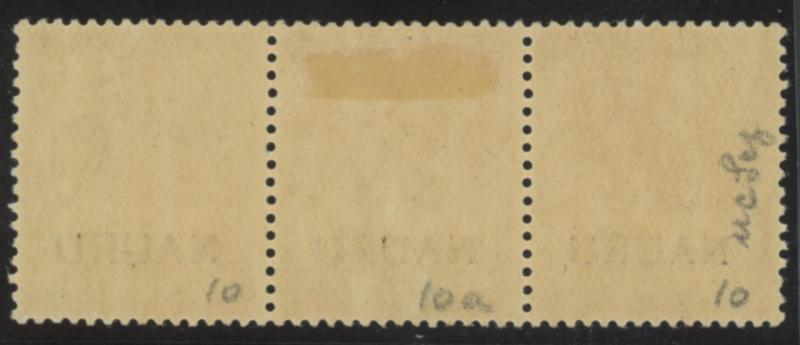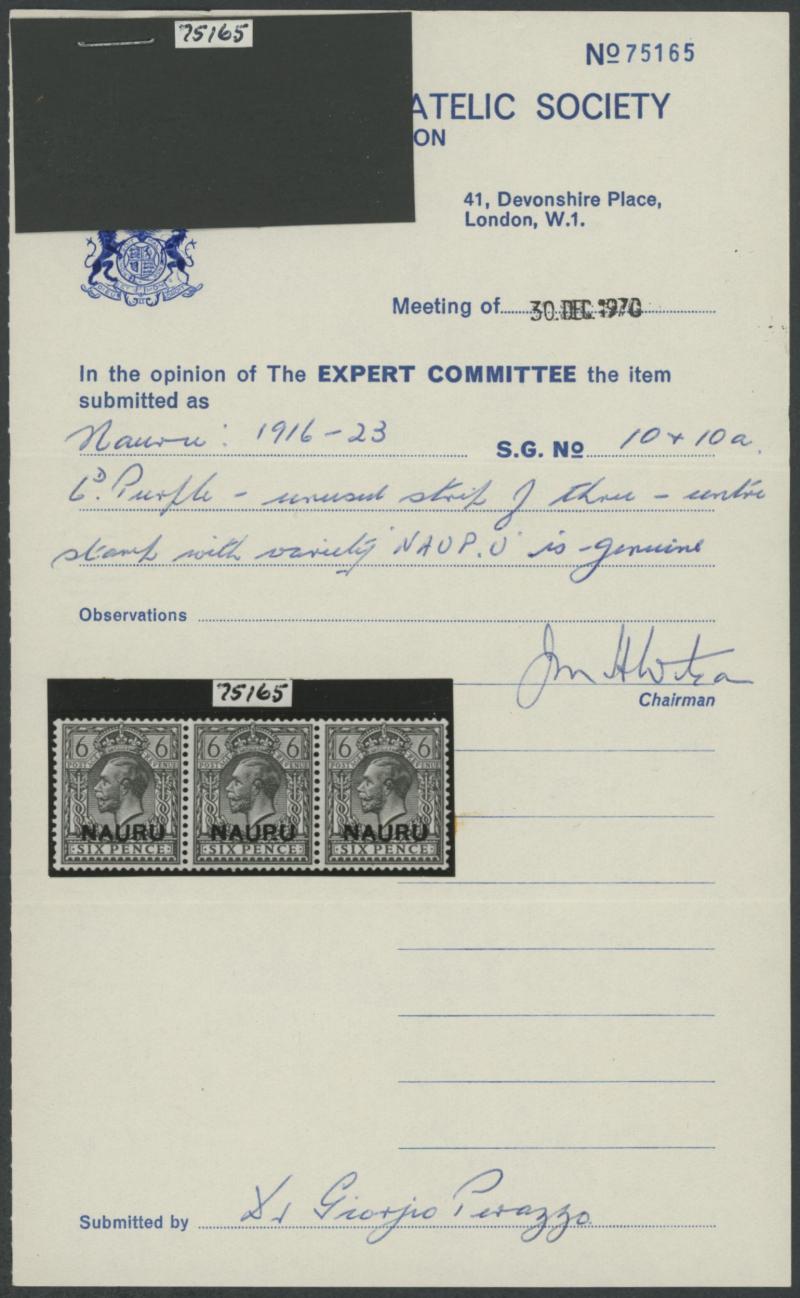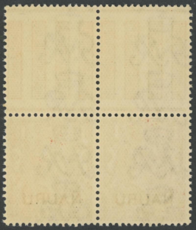 Broken 'R' in Overprint ('NAUPU') SG 10a, the central unit with a small hinge remainder, the other units unmounted, Cat £1600+ for singles. RPSL Certificate (1970). This is the highest denomination on which the 'NAUPU' error occurs. (Image1) (Image2)
