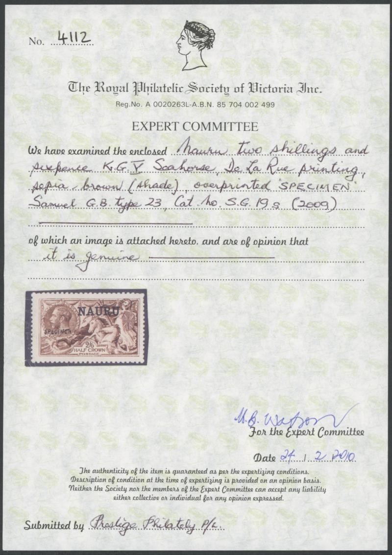 hinge remainder and KGV Seahorses De La Rue Printings 2/6d sepia-brown SG 19s & 5/- bright carmine SG 22s both with lightly tropicalised gum unmounted, Cat £815+ for mounted. RPSV Certificate (2010) for the 2/6d. (3) (Image1) (Image2)