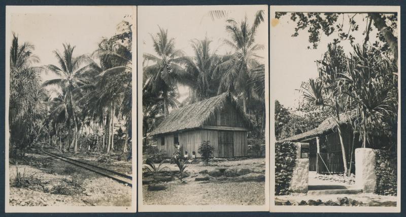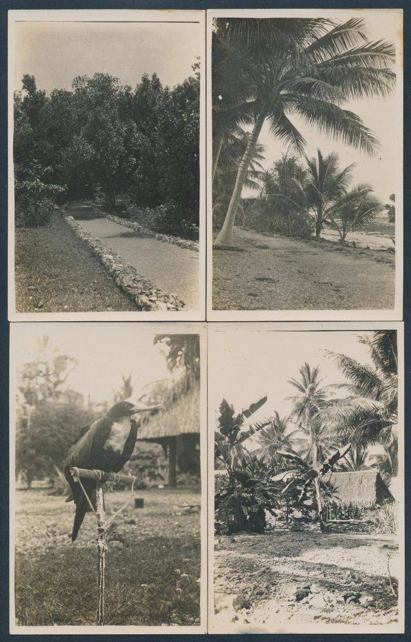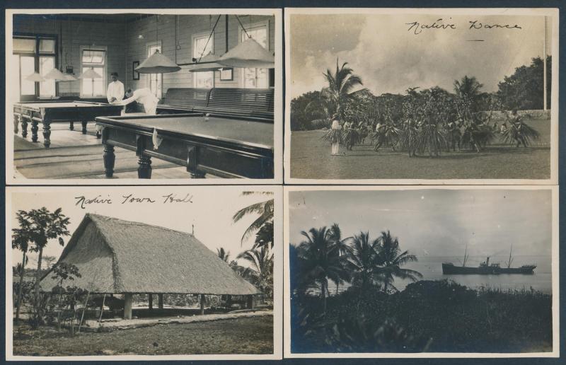 including two dance troupes (one endorsed on the reverse "Ocean Island Fandango"), islander housing & "Native Town Hall", "Entrance to Government Offices" (with mail box), bustling activity in a billiards room, "The Tapriva-Ooma Main Trunk Line"