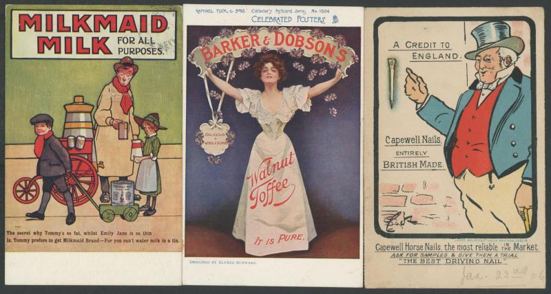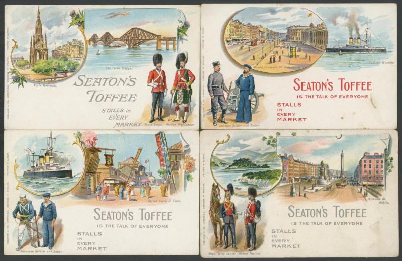 ADVERTISING: British products including Marmite, Seatons Toffees chromolithos x4, Barker & Dobson's Toffees, Patcho, Keen's