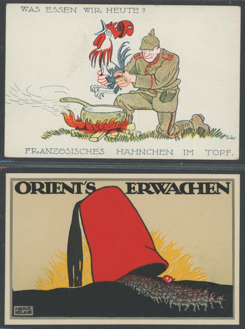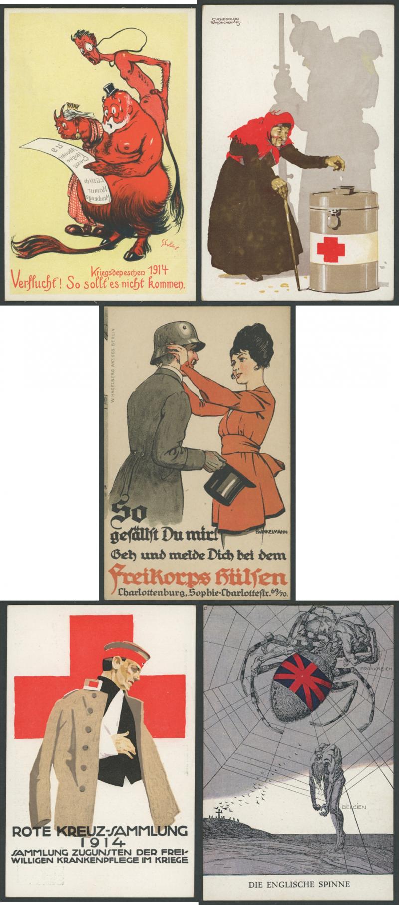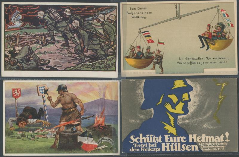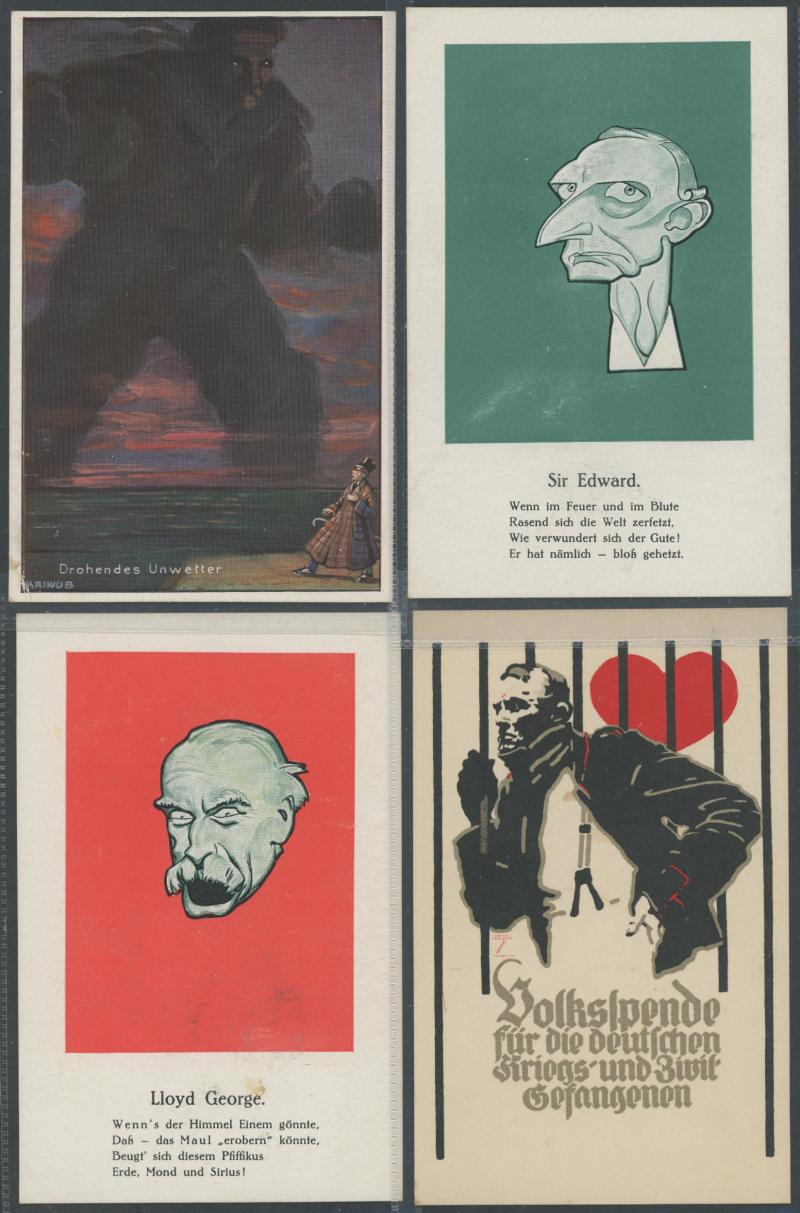 GERMANY: World War I artist propaganda cards promoting German heroes, soldier welfare, anti-Allies including specific anti-British