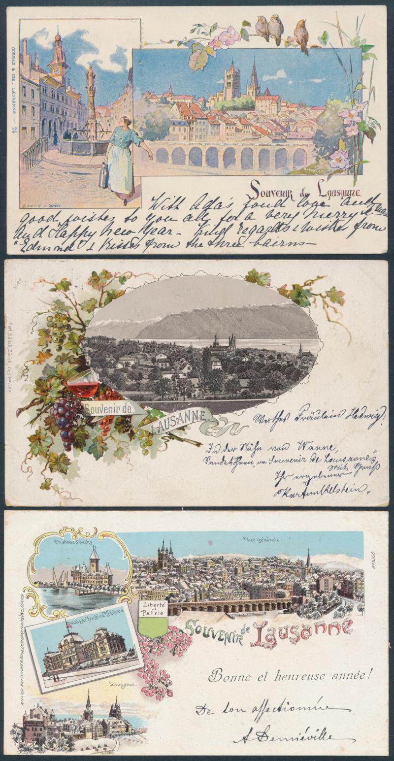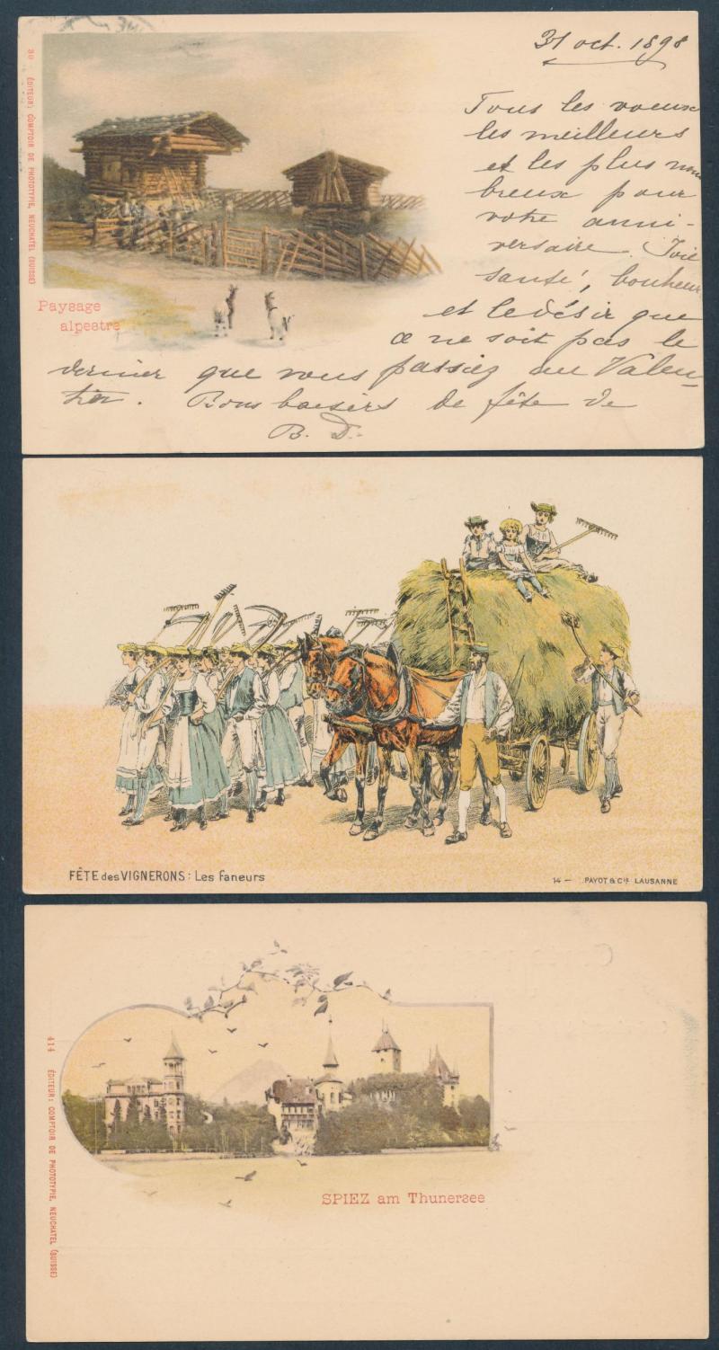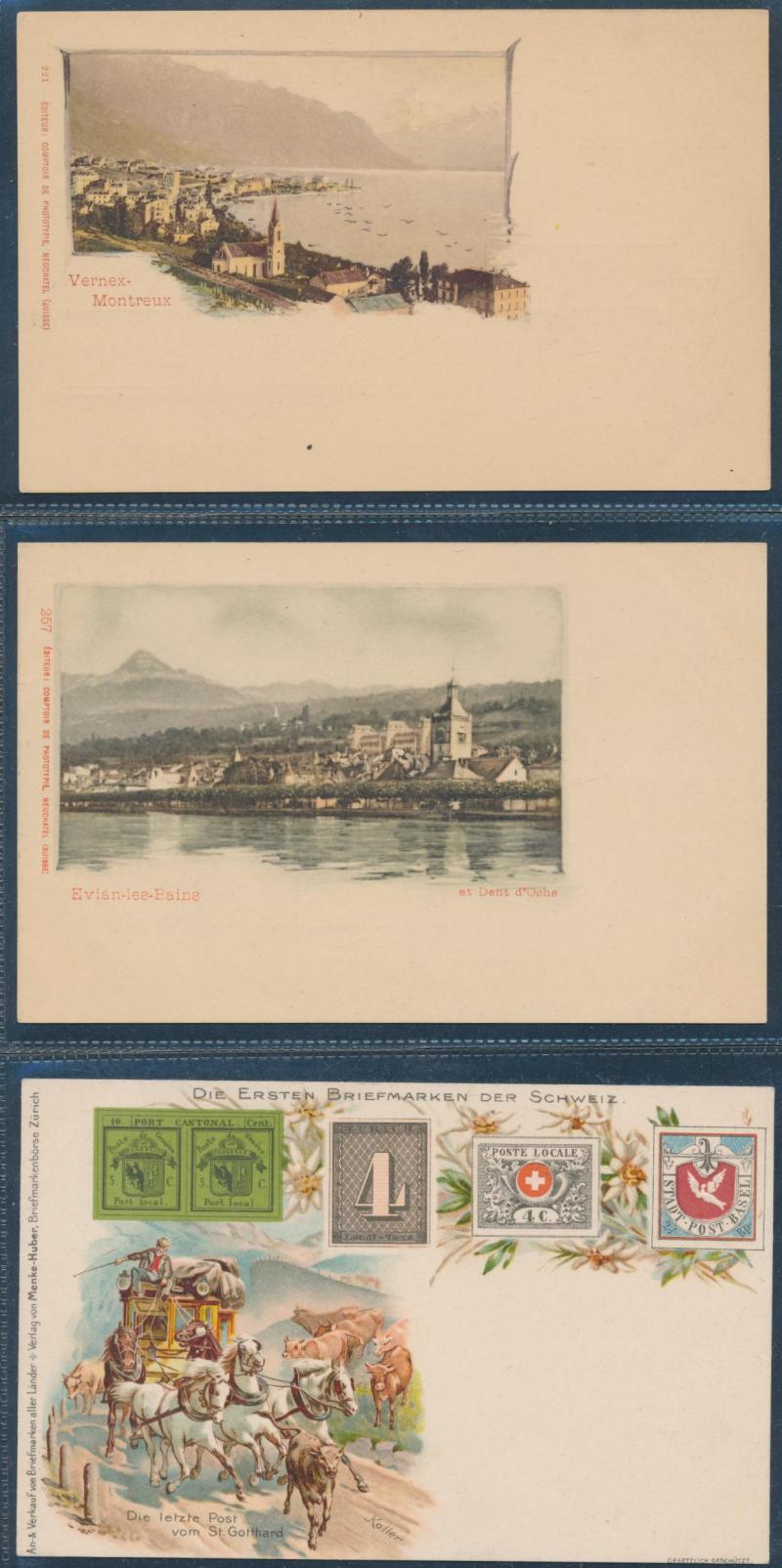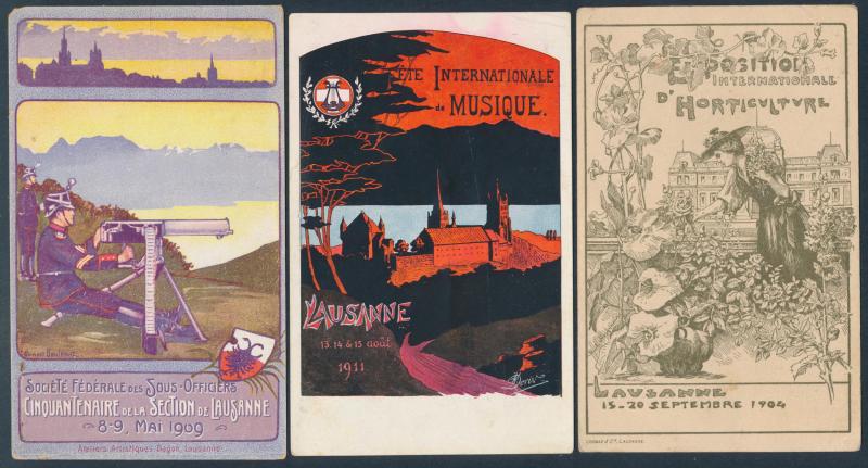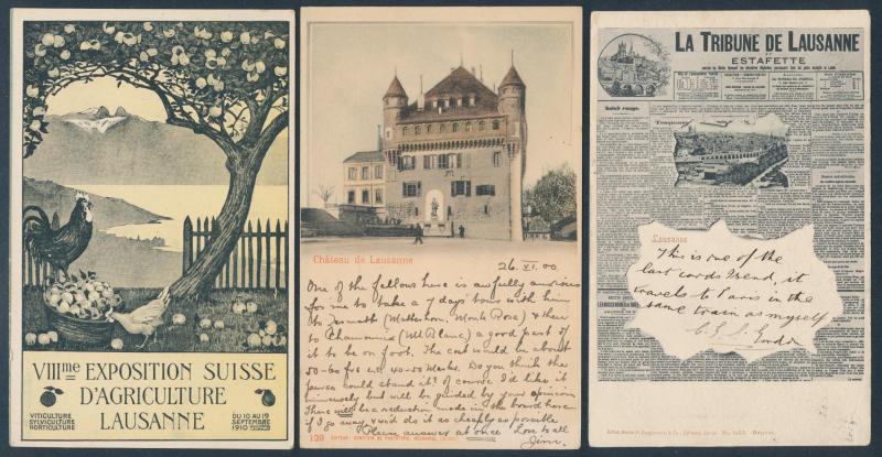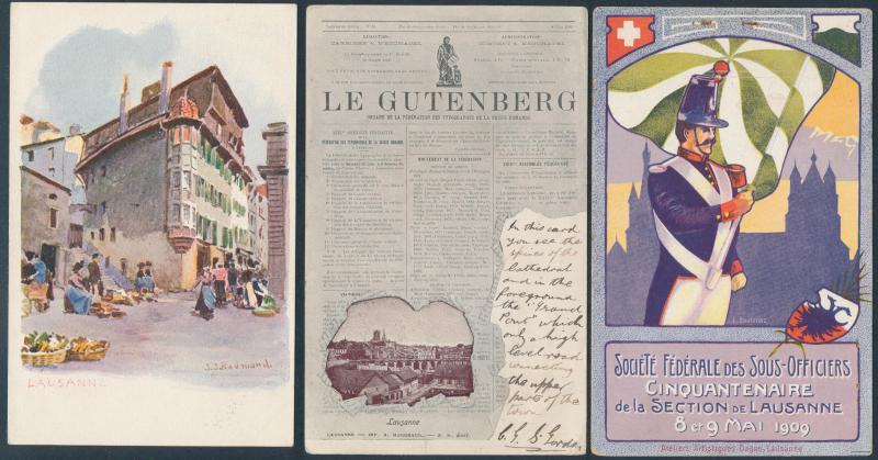 towns, numerous chromolitho artist cards many used 1897 to 1900, decorative frames including local newspapers & Swiss stamps and Art Nouveau elements, map types featuring the Lake, excellent range of commemorative types, exhibitions and advertising,