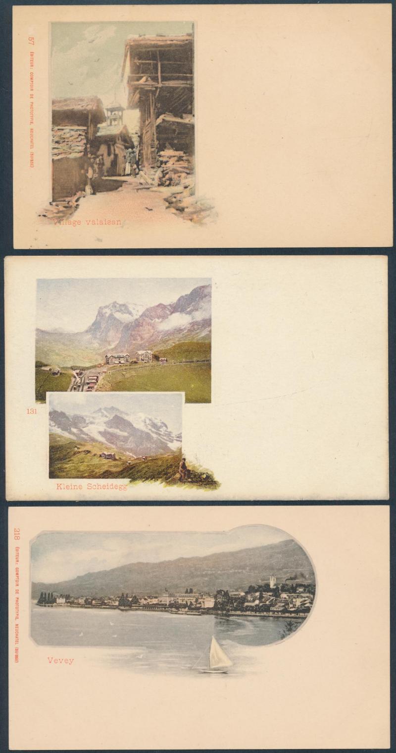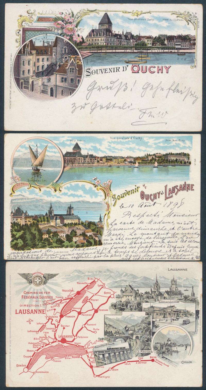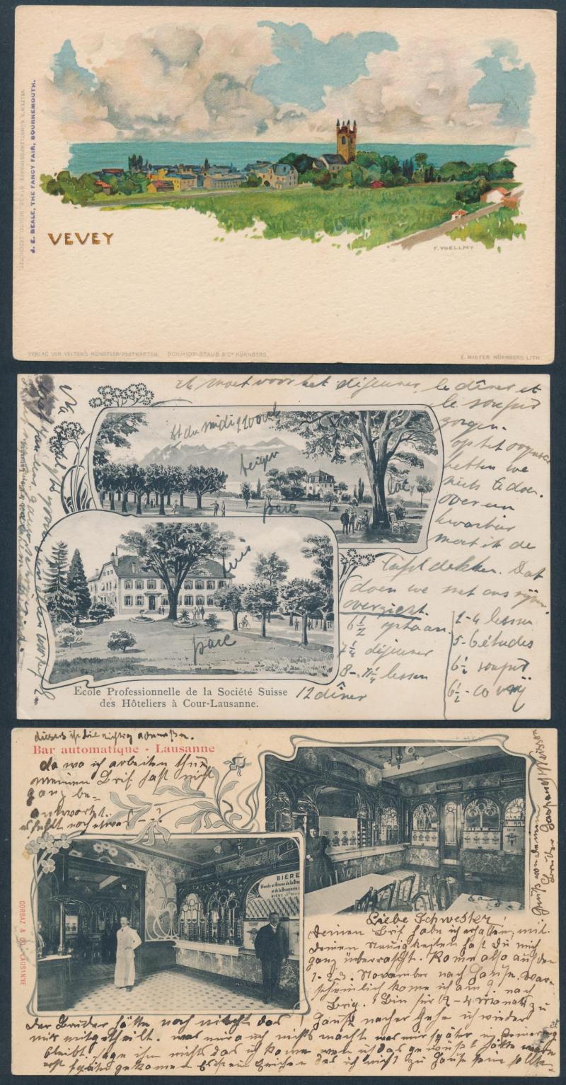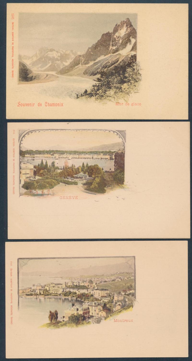 towns, numerous chromolitho artist cards many used 1897 to 1900, decorative frames including local newspapers & Swiss stamps and Art Nouveau elements, map types featuring the Lake, excellent range of commemorative types, exhibitions and advertising,