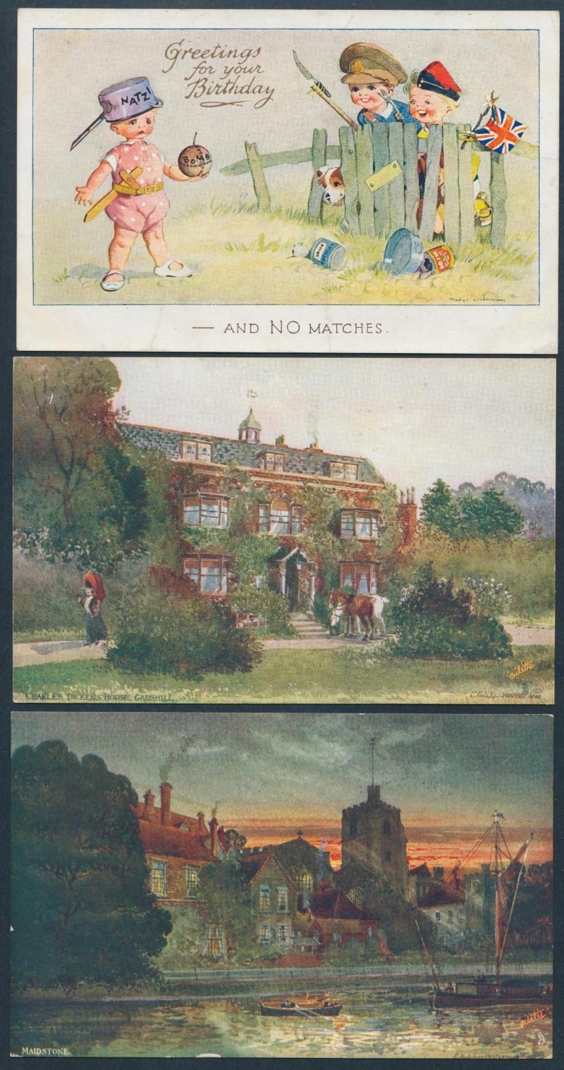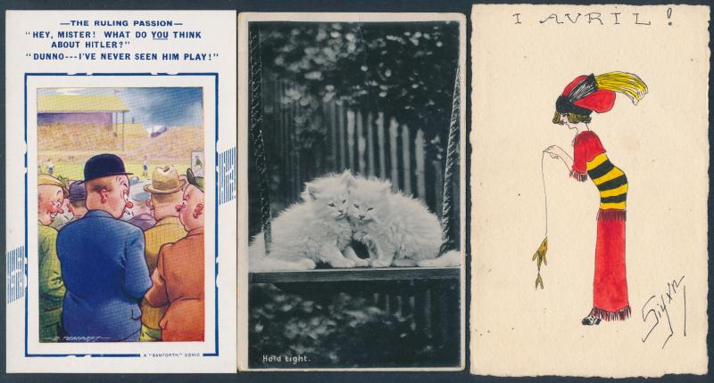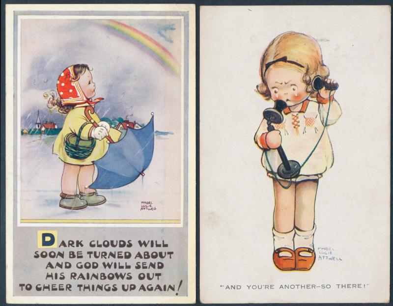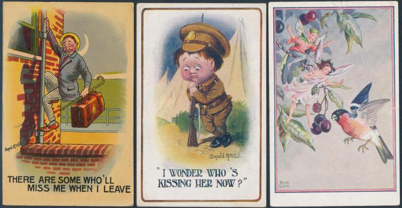 HUMOUR: Delightful batches of cutesy cards by Mabel Lucie Attwell, pre-smutty Donald McGill subjects, some 'gentle racism', etc,