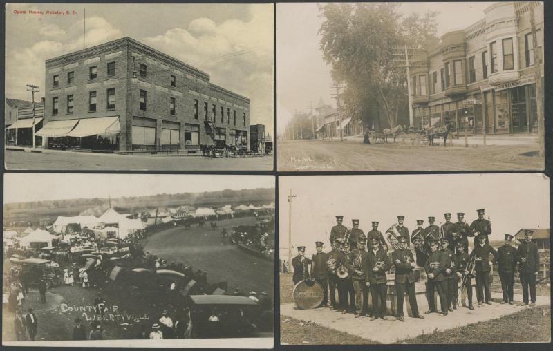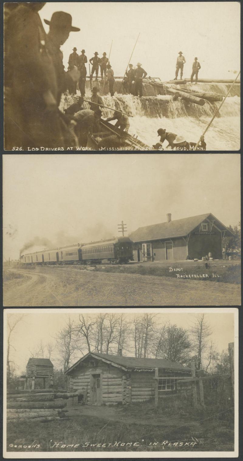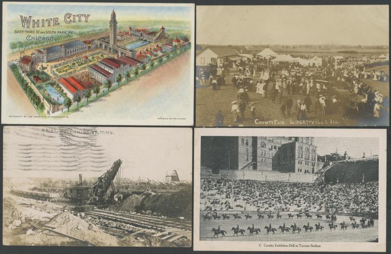 loggers at rapids, excellent Libertyville ILL group including County Fair x2, log cabin in Alaska, superb 1907 White City Chicago chromolitho, 1910 Cavalry Exhibition in Tacoma WA x5, no linens, fine to very fine used or unused.