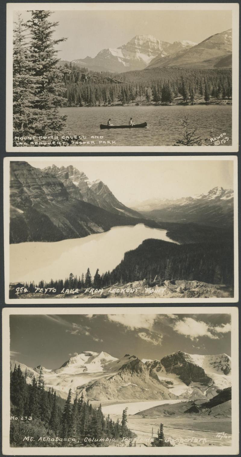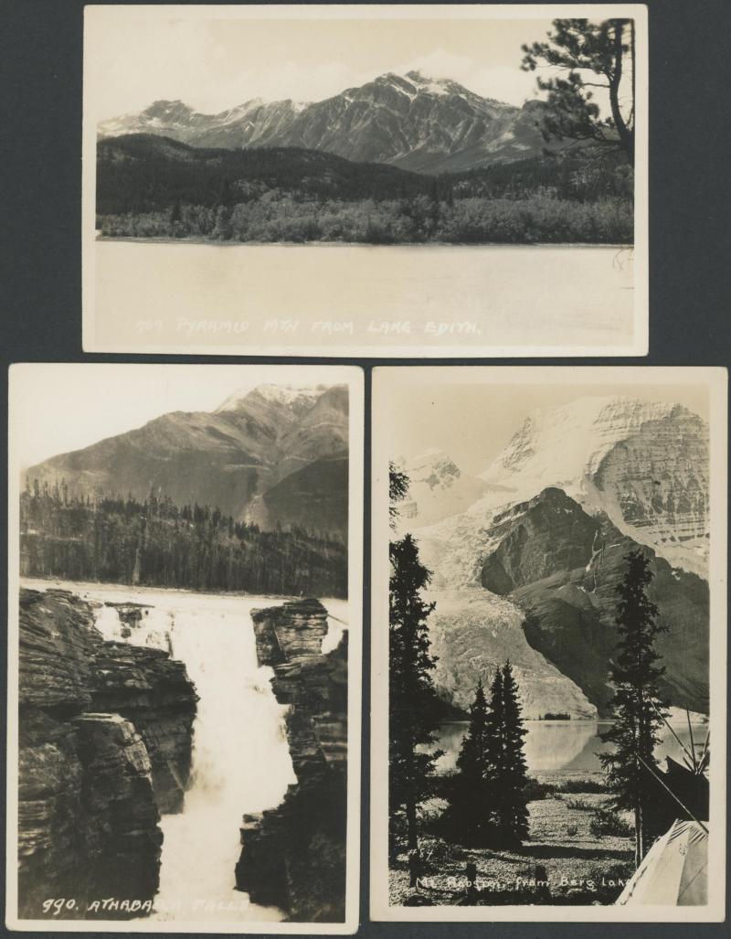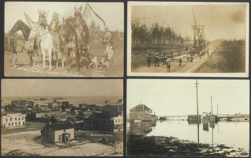 notably a marvellous group photo at the 1912 Calgary Stampede, 'Regina Flood Apr 12 1916', Carillion Que x3 including train at station, 'Birds Eye View of Gleichen Alta', etc, fine to very fine used or unused; also circa 1930s Jasper National Park