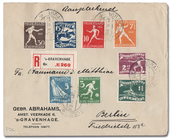 8683 cover B25-B32 image1928, 1½c-30c Olympics complete (Scott B25-B32), tied by sGravenhage c.d.s.s on a Registered First Day cover to Berlin.