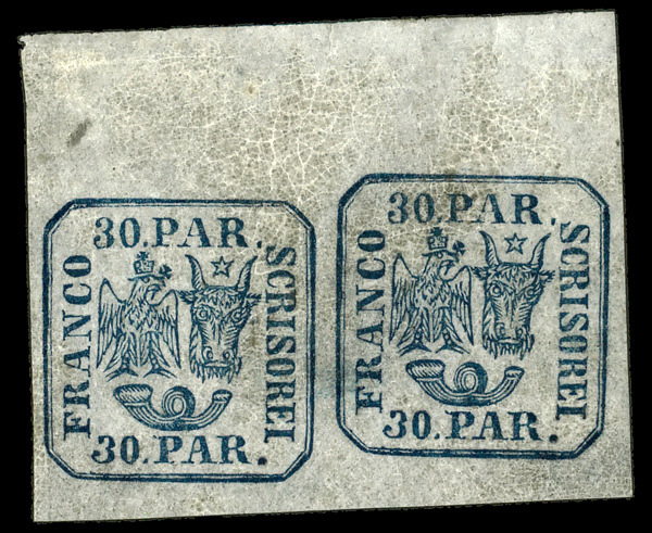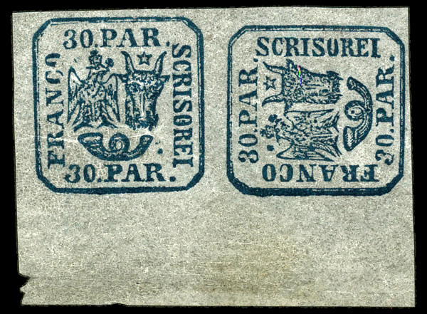 8706 nh 21b image1864, Moldavia-Walachia, typographed, 30pa deep blue (Scott 21b), pair, one sideways, o.g., never hinged, Extremely Fine.