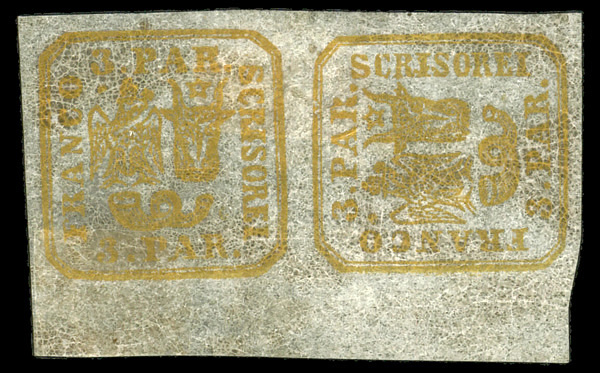 8702 og 19b image1864, Moldavia-Walachia, typographed, 3pa yellow (Scott 19b), pair, one sideways, o.g., hinge remnant, Extremely Fine.