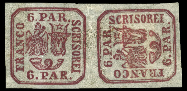 8704 og 20b image1864, Moldavia-Walachia, typographed, 6pa deep rose (Scott 20b), pair, one sideways, o.g., hinged, Extremely Fine.