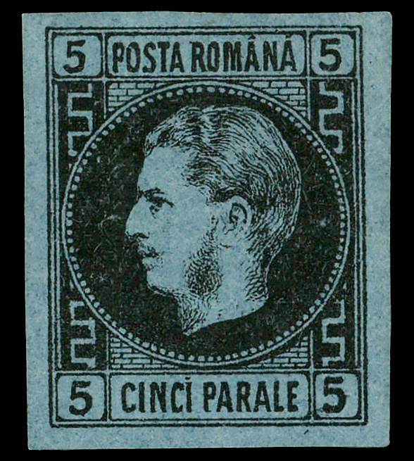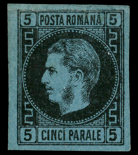 8714 og 30 image1866-67, Prince Carol, 5pa black on dark blue, thin paper (Scott 30), single, o.g., lightly hinged, Extremely Fine.