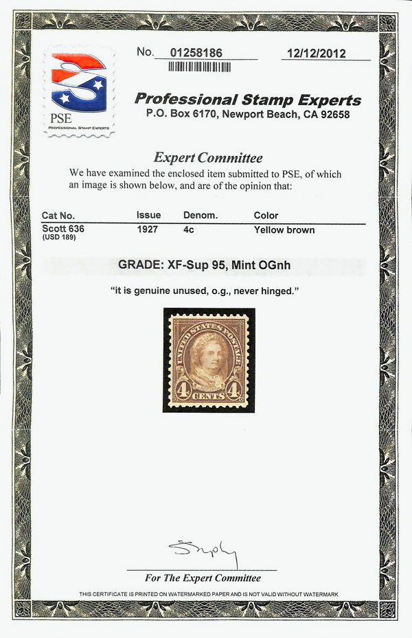 8246 nh 636 image1927, 4¢ Martha Washington, rotary press printing (Scott 636), exceptional rich brilliance, o.g., never hinged, Extremely Fine to Superb, with 2012 P.S.E. certificate graded XF-SUP 95.