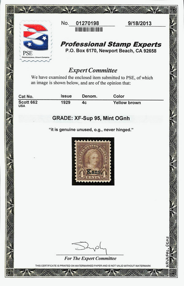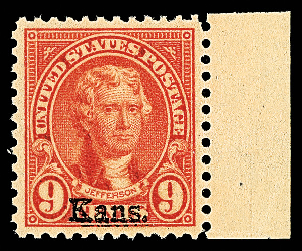 8264 nh 664 image1929, 6¢ Kans. (Scott 664), broad borders, sharp strike, o.g., never hinged, Extremely Fine to Superb, with 2011 P.S.E. certificate.