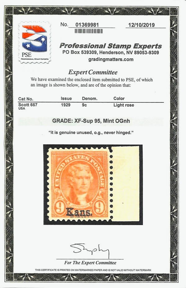 8265 nh 667 image1929, 9¢ Kans. (Scott 667), unblemished margins, o.g., never hinged, Extremely Fine to Superb, with 2019 P.S.E. certificate graded XF-SUP 95.