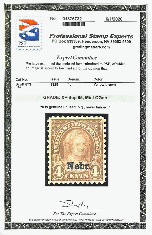 8268 nh 673 image1929, 4¢ Nebr. (Scott 673), premium eye appeal, o.g., never hinged, Extremely Fine to Superb, with 2020 P.S.E. certificate graded XF-SUP 95.