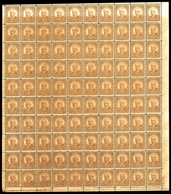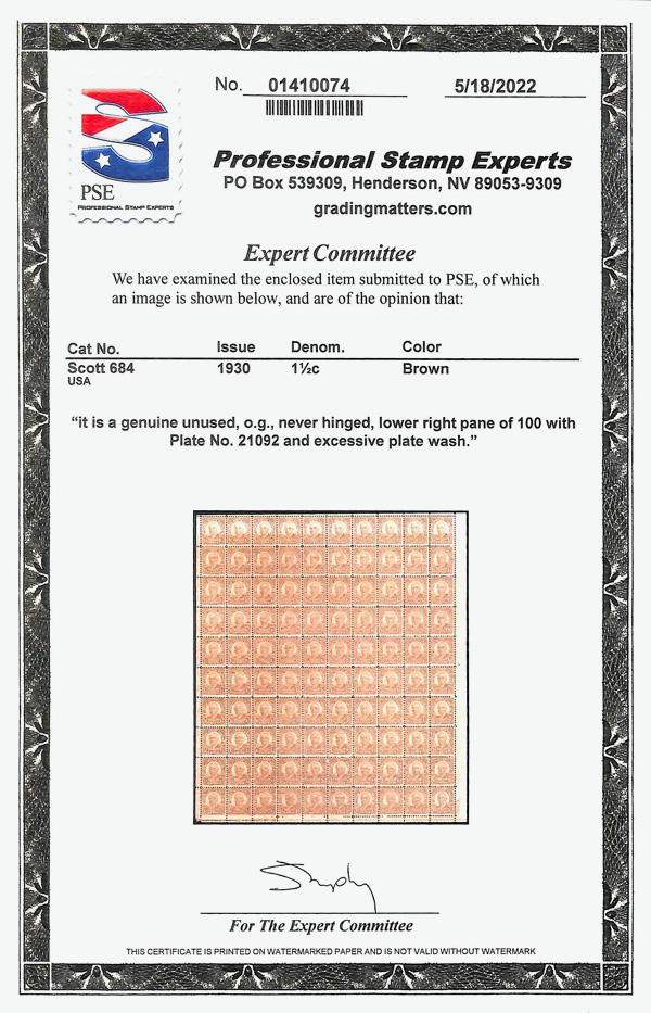 8271 nhbl 684 image1930, 1½¢ Harding, rotary press printing (Scott 684), bottom right full pane of 100 with plate number 21092, o.g., never hinged, sound with strong color on bright paper; excessive plate wash, Fine to Fine-Very Fine, with 2022 P.S.E. certificate.