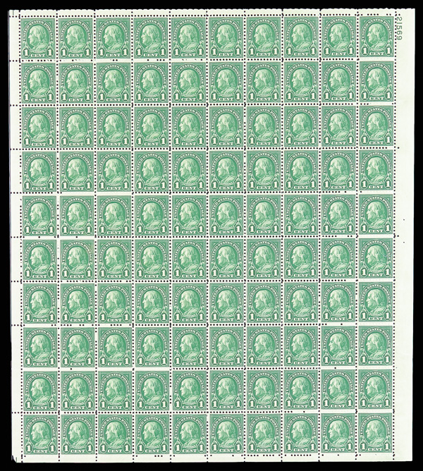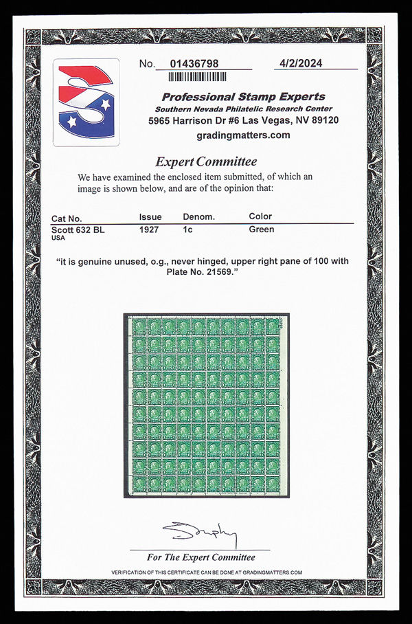 8243 nhbl 632 image1927, 1¢ Franklin, rotary press printing (Scott 632), top right full pane of 100 with plate number 21569, o.g., never hinged, pristine with bold color and sound perforations throughout, Fine to Very Fine, with 2024 P.S.E. certificate.