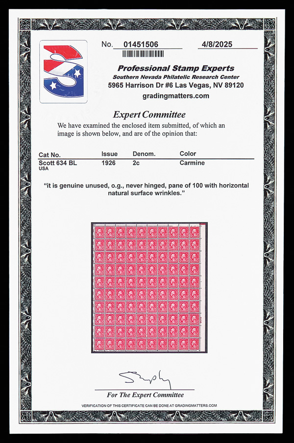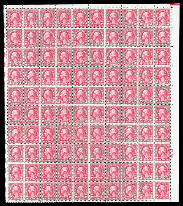 8244 nhbl 634 image1926, 2¢ Washington, type I, rotary press printing (Scott 634), bottom right full pane of 100 with plate number 21150, o.g., never hinged, Post Office fresh with rich color and crisp impression; horizontal natural surface wrinkles, Fine to Very Fine, with 2025 P.S.E. certificate.