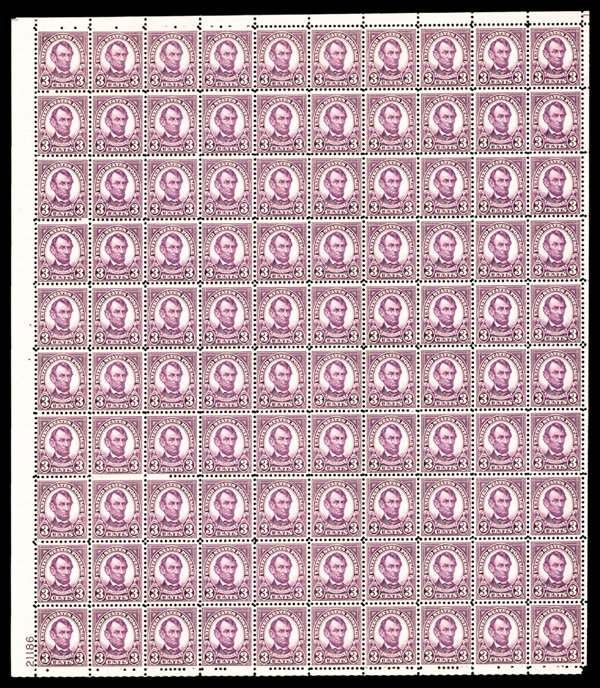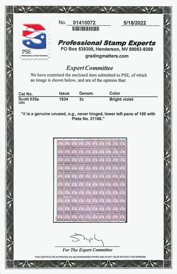 8245 nhbl 635a image1934, 3¢ Lincoln, bright violet, rotary press printing (Scott 635a), bottom left full pane of 100 with plate number 21186, o.g., never hinged, Post Office fresh and sound with attractive centering, Fine to Very Fine, with 2022 P.S.E. certificate.