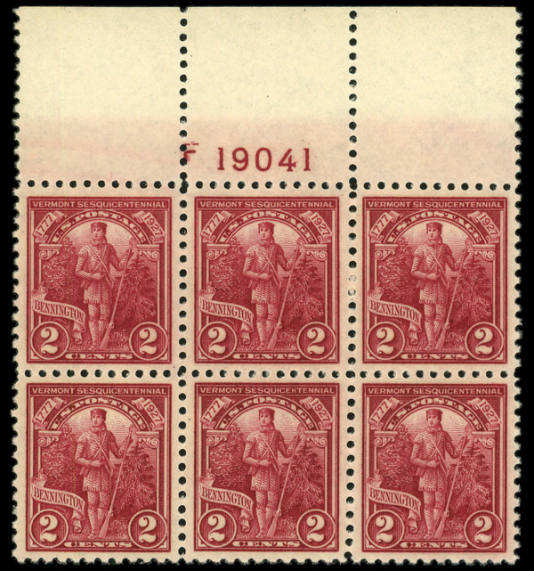 8247 nhbl 643 image1927, 2¢ Vermont (Scott 643), top margin F plate block of 6, remarkable centering, o.g., never hinged, Extremely Fine.