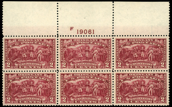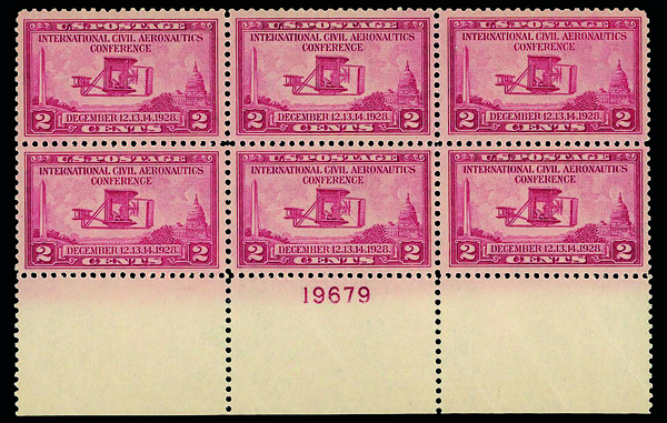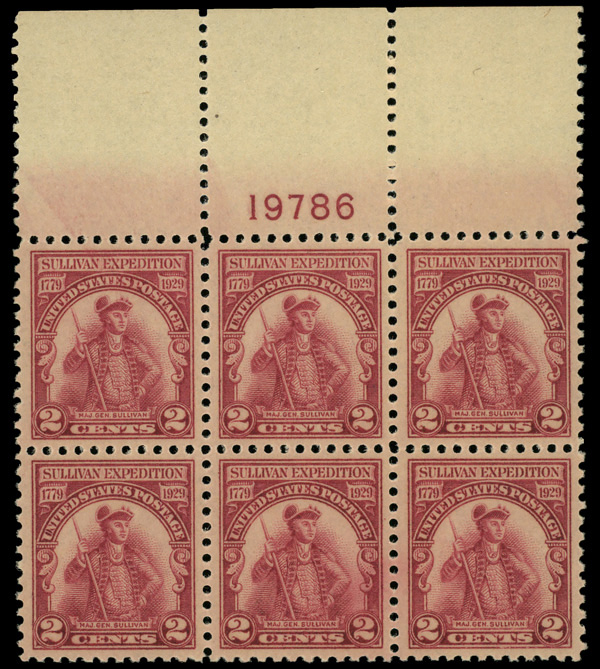 8259 nhbl 657 image1929, 2¢ Sullivan Expedition (Scott 657), top margin plate block of 6, Brilliant clean detail, o.g., never hinged, Very Fine to Extremely Fine.