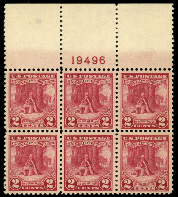 8249 nhbl 645 image1928, 2¢ Valley Forge (Scott 645), top margin plate block of 6, Wonderfully fresh tone, o.g., never hinged, Fine to Very Fine.