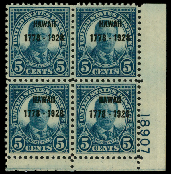 8252 nhbl 648 image1928, 5¢ Hawaii (Scott 648), bottom right plate block of 4, Bright color tone, o.g., never hinged, Very Fine.