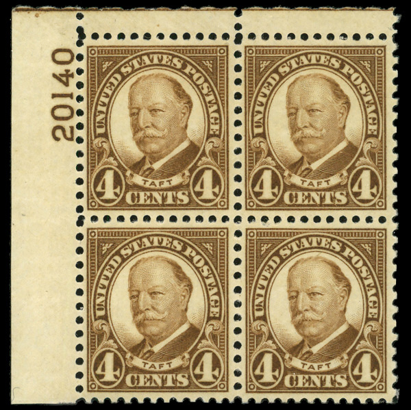 8272 nhbl 685 image1930, 4¢ Taft, rotary press printing (Scott 685), top left plate block of 4, Excellent brightness and tone, o.g., never hinged, Very Fine to Extremely Fine.