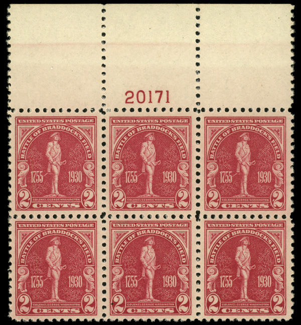 8274 nhbl 688 image1930, 2¢ Battle of Braddock's Field (Scott 688), top margin plate block of 6, Full rich color saturation, o.g., never hinged, Very Fine to Extremely Fine.