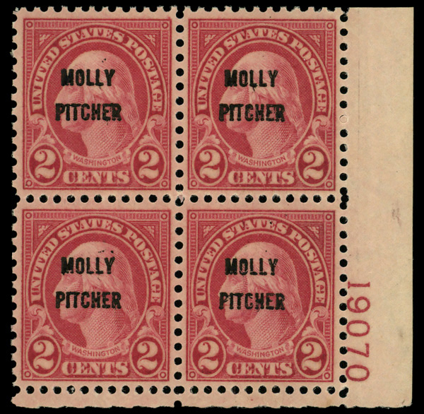 8250 nhbl 646 image1928, 2¢ Molly Pitcher (Scott 646), plate block of 4, o.g., never hinged, Extremely Fine.