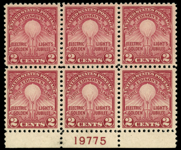 8255 nhbl 654 image1929, 2¢ Edison, flat plate printing (Scott 654), plate block of 6, o.g., never hinged (gum skips), Very Fine to Extremely Fine.
