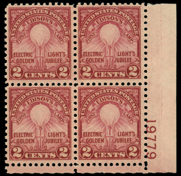 8256 nhbl 655 image1929, 2¢ Edison, rotary press printing (Scott 655), plate block of 4, o.g., never hinged, Very Fine.
