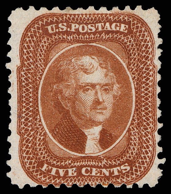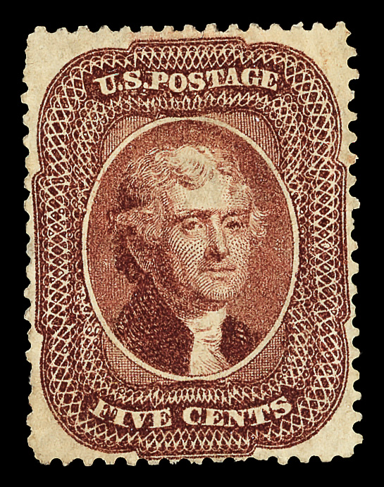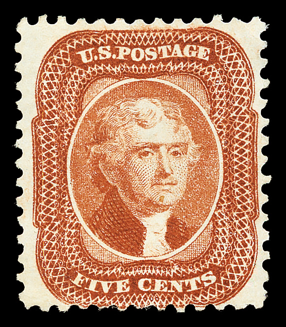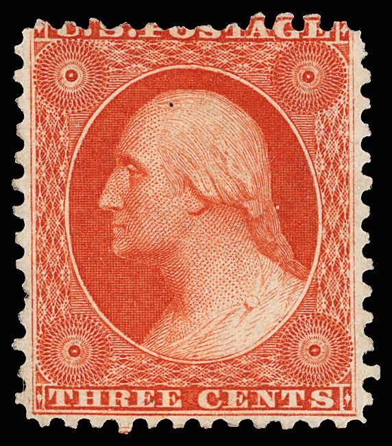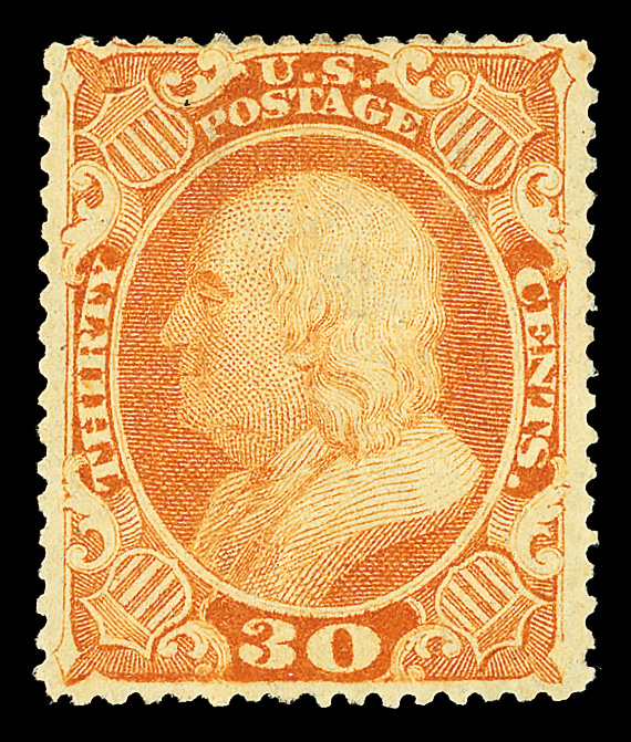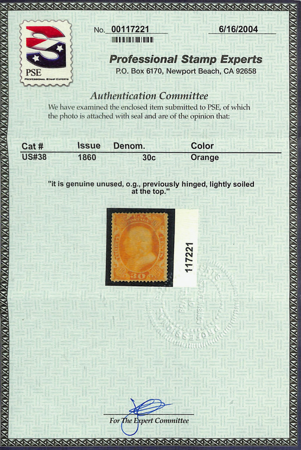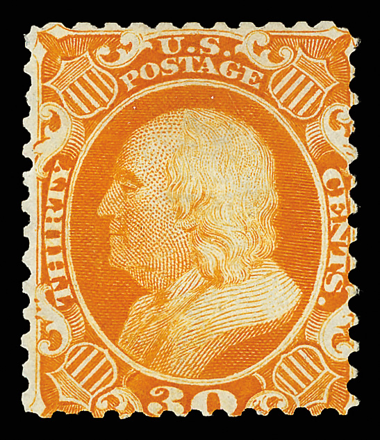 2386 og 38 image1860, 30¢ orange (Scott 38), o.g., lightly hinged, a striking stamp with exuberant, bold color and appealing centering; lightly soiled at top, Very Fine nonetheless, with 2004 P.S.E. certificate.