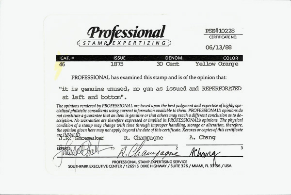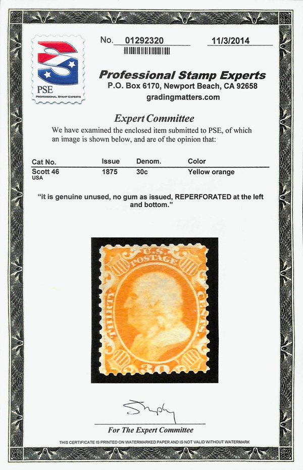 2396 ng 46 image1857-60 (1875 Reprint), 30¢ yellow orange (Scott 46), without gum as issued, fresh and bright on matching paper; reperforated at left and bottom, Very Good appearance, only 480 sold, with 1988 and 2014 P.S.E. certificates.