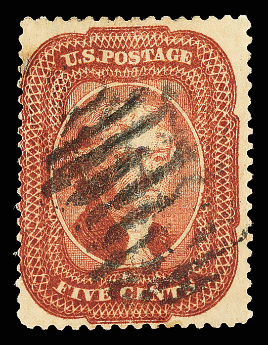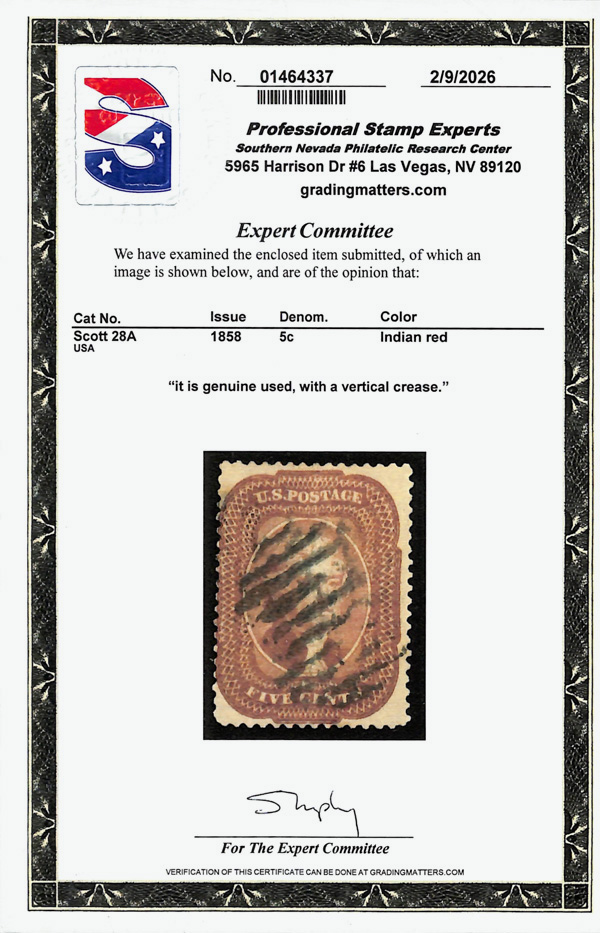 2378 O 28A image1858, 5¢ Indian red, type I (Scott 28A), position 23R1, fresh-faced with luxuriant color and grid cancel; vertical crease, otherwise Fine to Very Fine, with 2026 P.S.E. certificate.