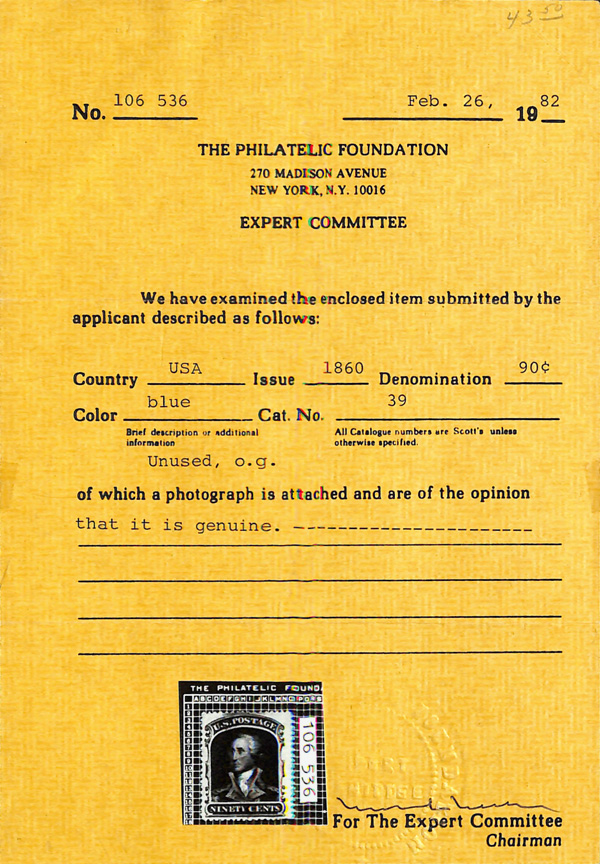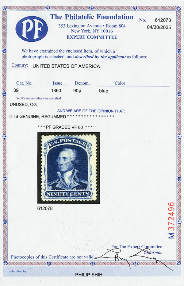2389 ng 39 image1860, 90¢ blue (Scott 39), regummed, sound and fresh with robust color and clean detail, margins well clear all around, Very Fine, with 1982 and 2025 P.F. certificates, the latter graded VF 80.