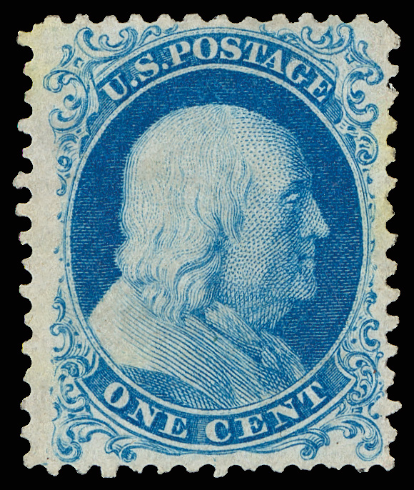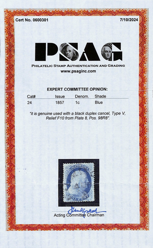 2372 O 24 image1857, 1¢ blue, type V (Scott 24), Relief F10, position 98R8, clean and sound with flawless centering and deep, intense color; town cancels unobtrusive and nearly face-free, Extremely Fine to Superb, only five Type V stamps grade higher in PSE's Population Report, with 2024 P.S.A.G. certificate. (Image) (Image2) (All Images)