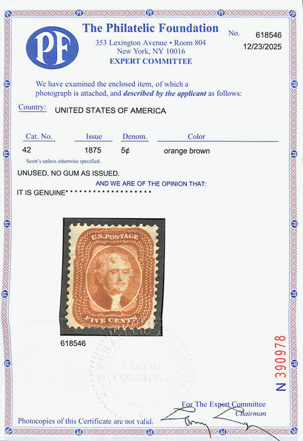 2392 ng 42 image1857-60 (1875 Reprint), 5¢ orange brown (Scott 42), without gum as issued, bright and fresh with rich color on like-new paper, Fine, only 878 sold, with 2025 P.F. certificate.