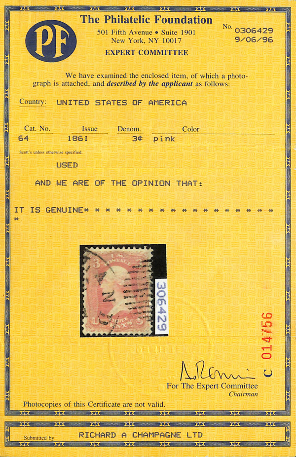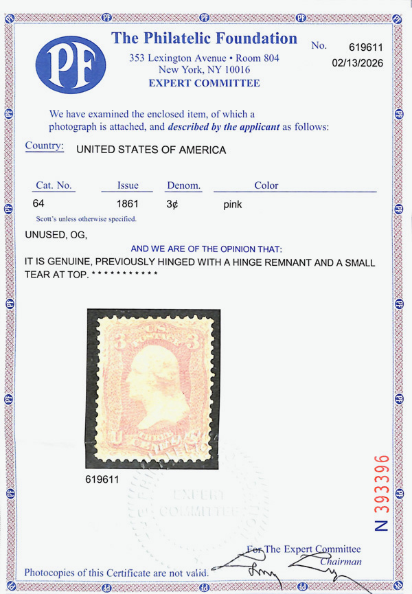 2399 og 64 image1861, 3¢ pink (Scott 64), o.g., hinge remnant, fresh-faced with alluring color and centering; small tear at top, otherwise Very Fine, with 2026 P.F. certificate.