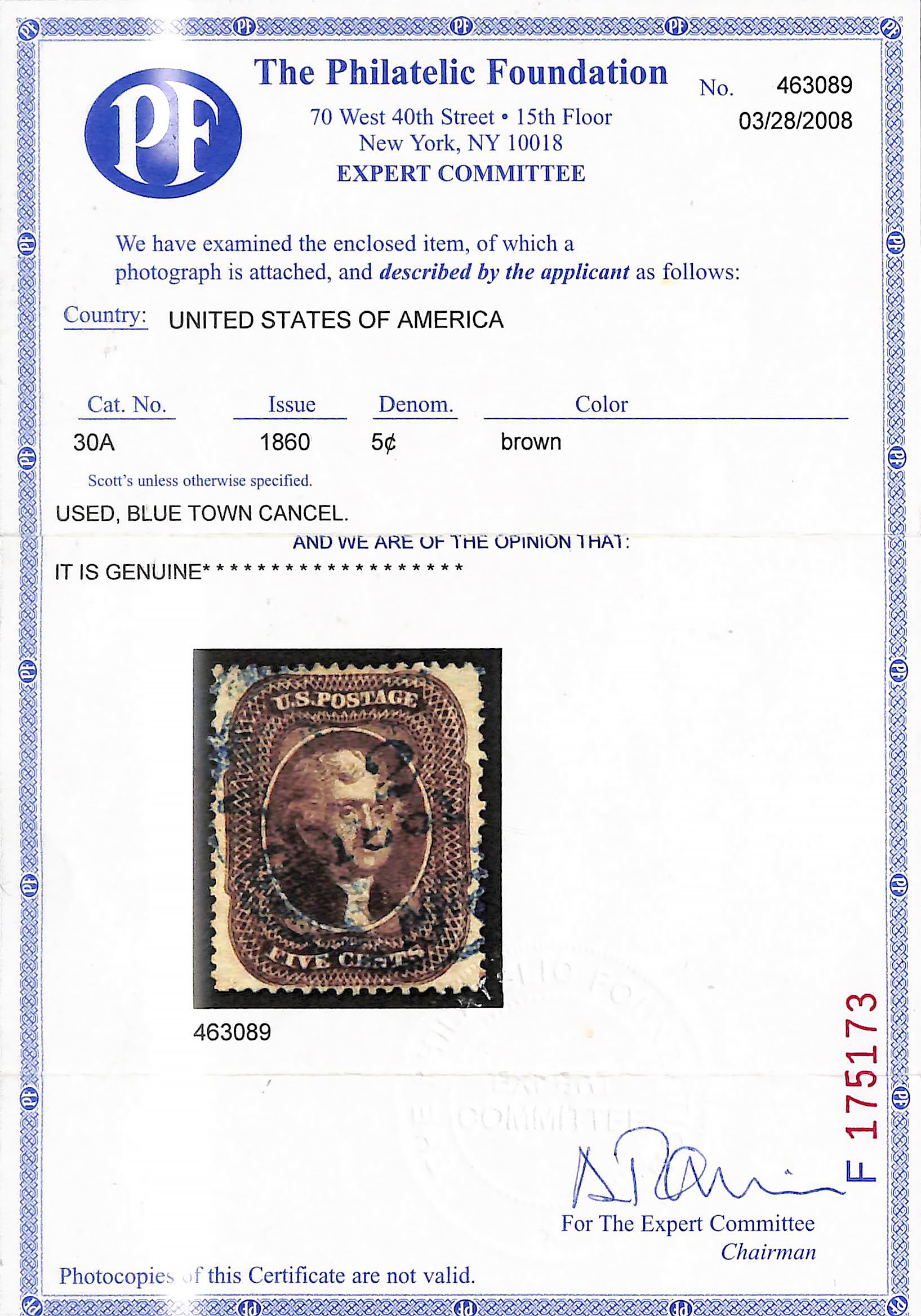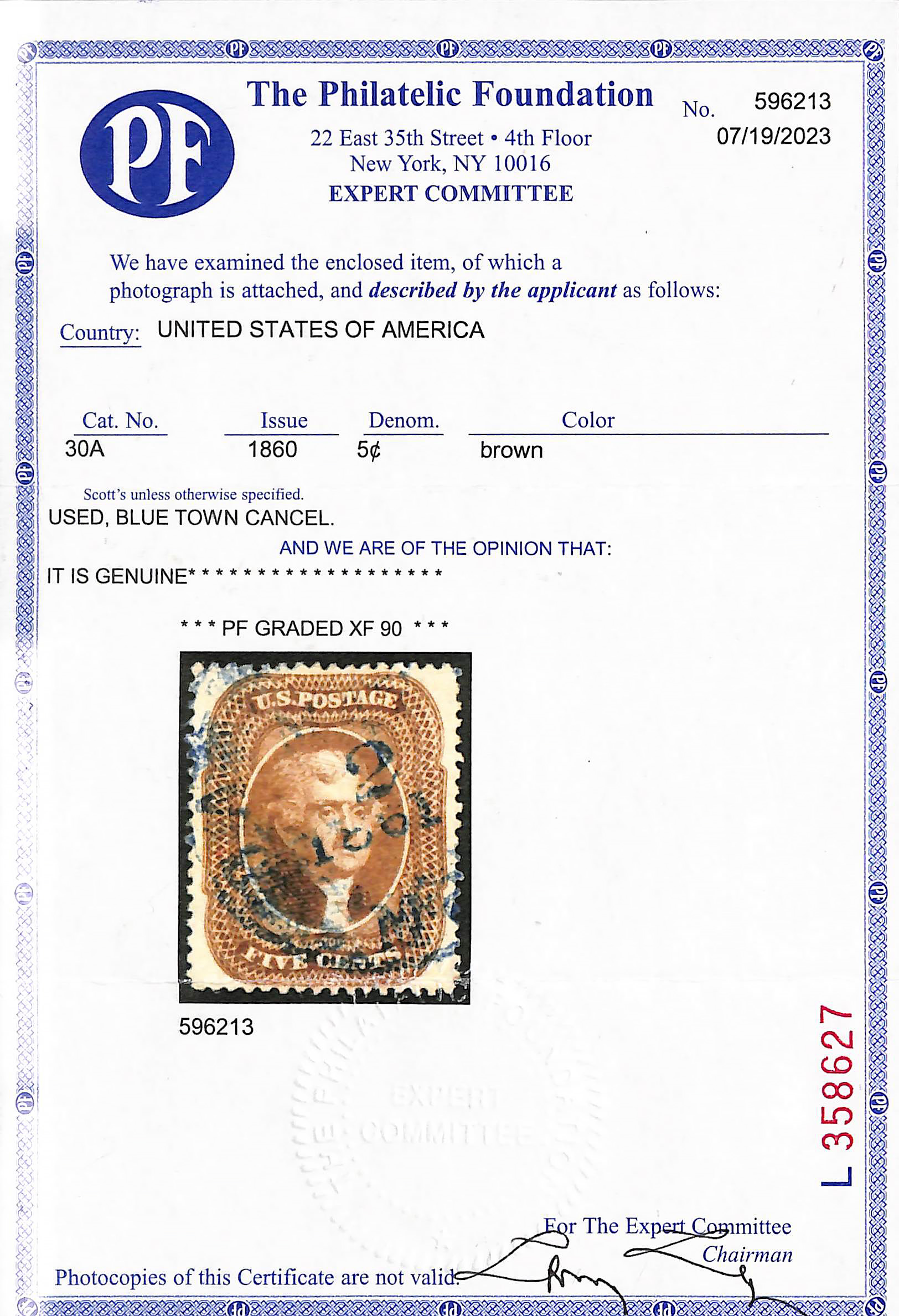 2380 O 30A image1860, 5¢ brown, type II (Scott 30A), sound and Post Office fresh with strong color, clean impression and blue town 1861 postmark, Extremely Fine, with 2008 and 2023 P.F. certificates, the latter graded XF 90.