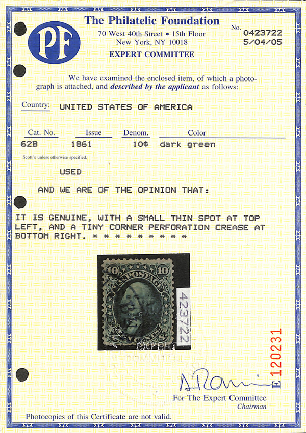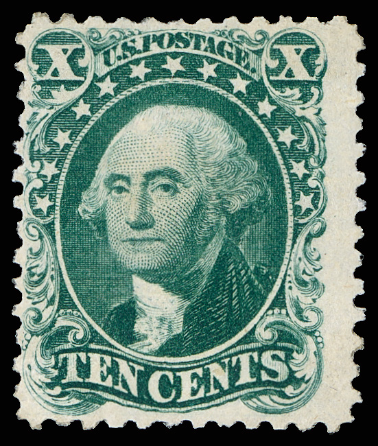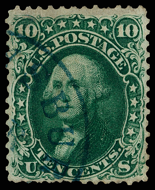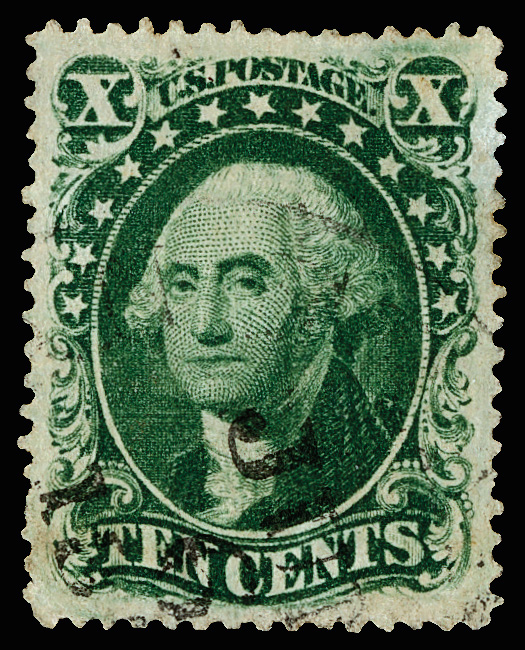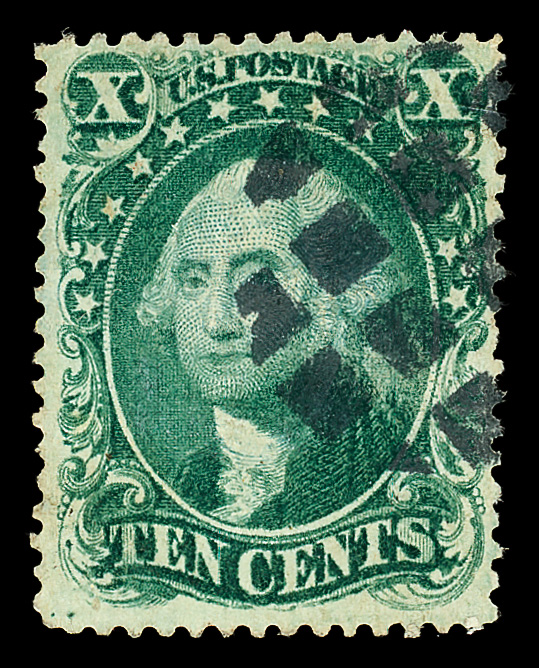 2397 O 62B image1861, 10¢ dark green, First Design (Scott 62B) (Harr)isbur(gh) (?) PA circular datestamp, deep rich color; reperfed (not noted on cert), small thin spot and tiny corner perf crease, Fine appearance, with 2005 P.F. certificate.