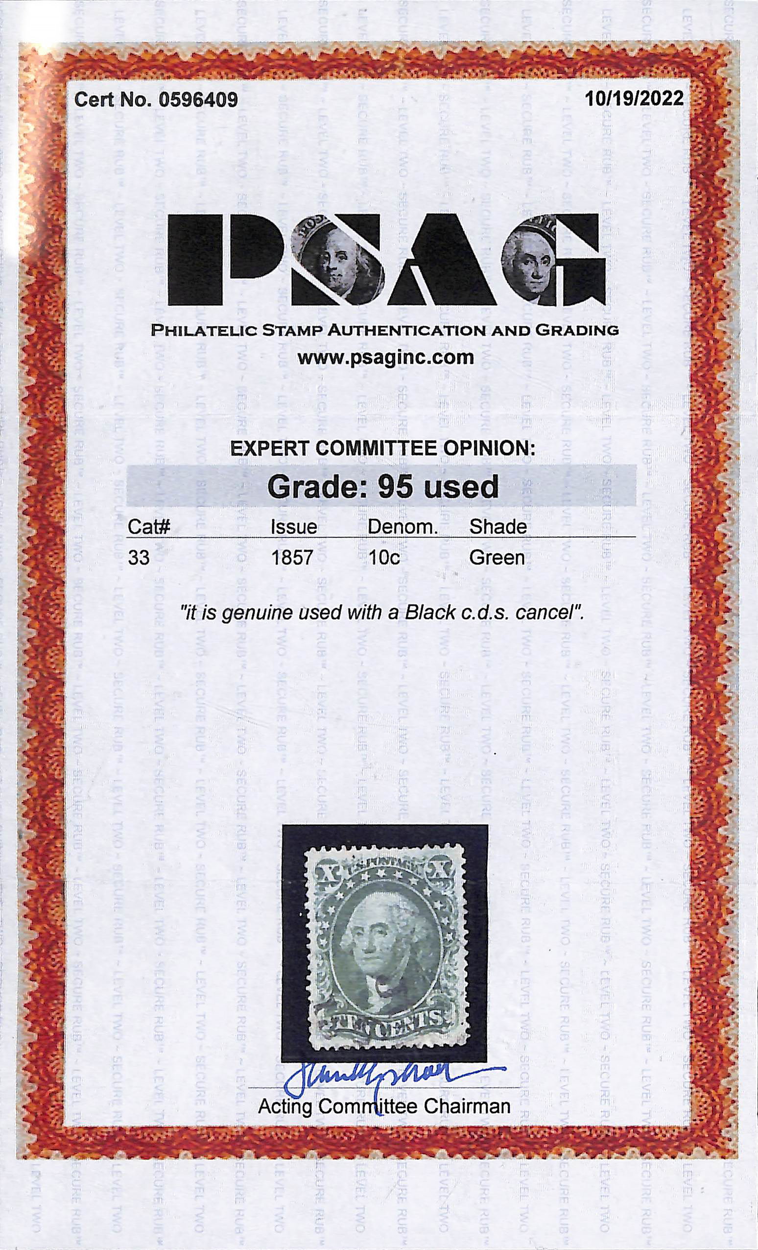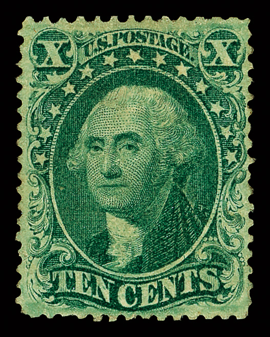 2382 O 33 image1857, 10¢ green, type III (Scott 33), a stunner with flawless color, impression and freshness; black town postmark light and face-free, Extremely Fine to Superb, destined for a collection of distinction, only three stamps grade higher in PSE's Population Report, with 2022 P.S.A.G. certificate graded XF-SUP 95.