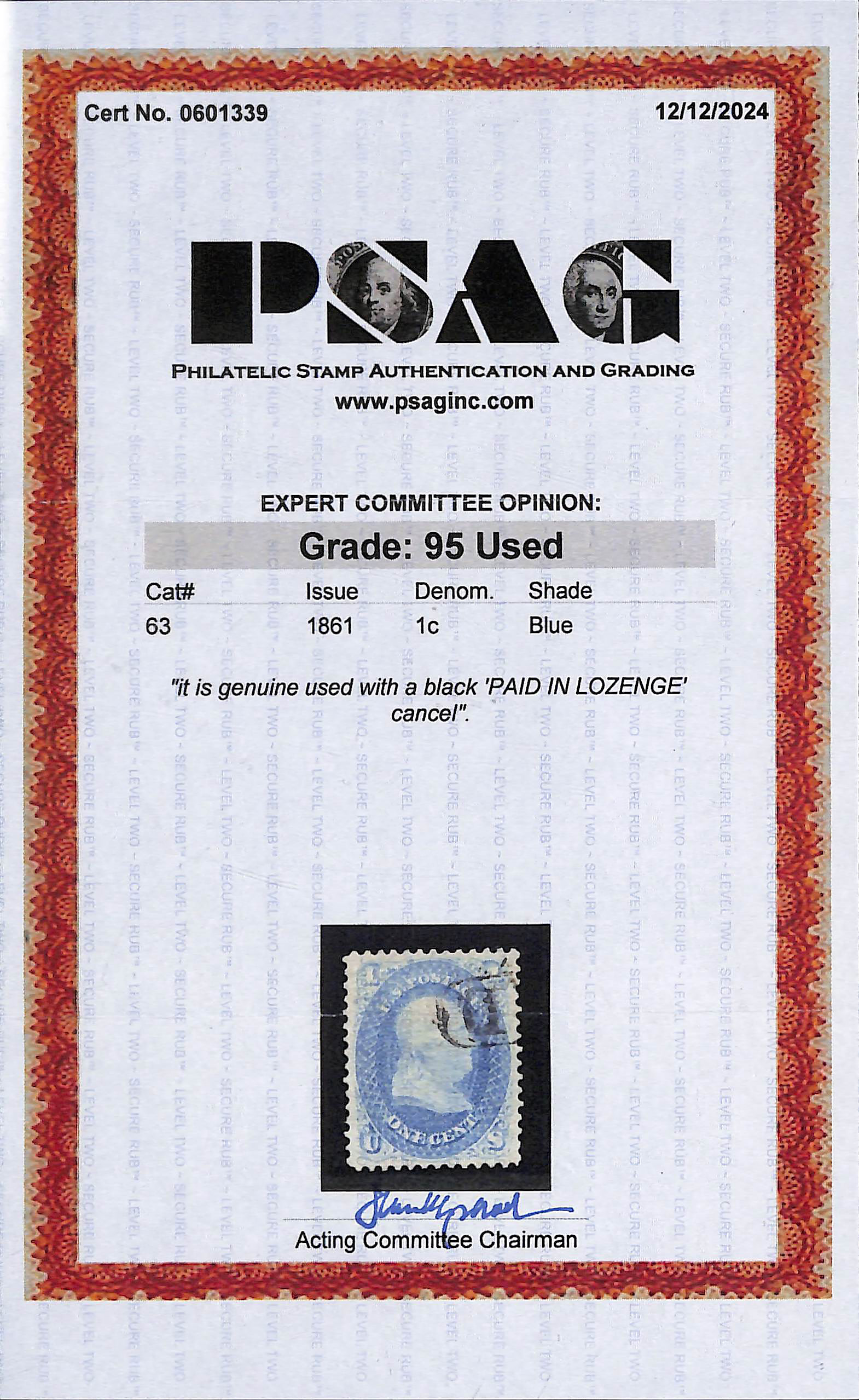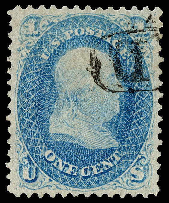 2398 O 63 image1861, 1¢ blue (Scott 63), eye-catching with exceptionally fresh color on bright paper, sound and mathematically centered, with partial "PAID" in lozenge cancel, Extremely Fine to Superb, select, with 2024 P.S.A.G. certificate graded XF-SUP 95.