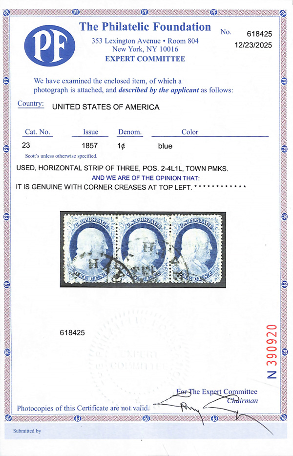 2370 O 23 image1857, 1¢ blue, type IV (Scott 23), positions 2-4L1L, horizontal strip of 3, fresh and clean with alluring color and town postmarks, each well centered; corner creases at top left, otherwise Very Fine, with 2025 P.F. certificate.