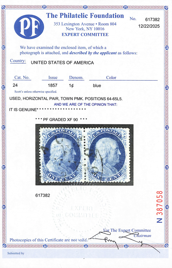 2371 O 24 image1857, 1¢ blue, type V (Scott 24), positions 64-65L5, horizontal pair, Post Office fresh with immense color depth and bold lines, town postmark essentially face-free, Extremely Fine, with 2025 P.F. certificate graded XF 90.
