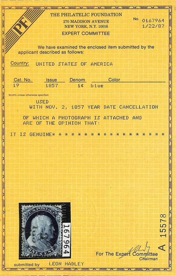 2362 O 19 image1857, 1¢ blue, type Ia (Scott 19), fresh and crisp with intense color and sharp detail; Nov. 2, 1857 year date cancel, Very Fine, with 1987 P.F. certificate.